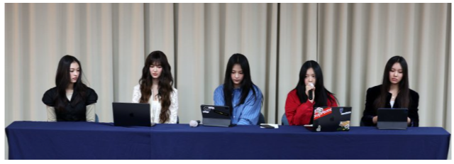 뉴진스라는 이름을 사용하지 못할 경우 기존 곡들의 무대가 어려워질 수 있다는 기자의 질문에, 멤버들은 "앞으로 어떻게 해결할지 논의해 나갈 예정"이라고 답했습니다.