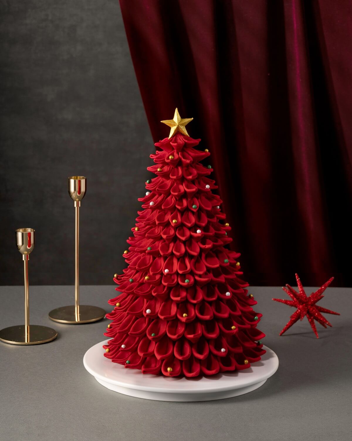 - 초코 시트에 에스프레소, 쇼콜라, 마스카포네 필링을 샌드하였으며, 크리스마스 트리 모양을 붉은색 슈가 잎으로 표현해 연말 분위기 가득한 스페셜 케이크입니다.